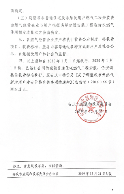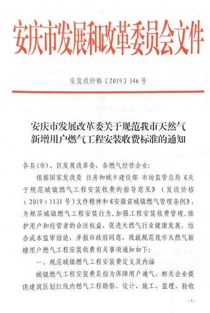 安慶市發(fā)展改革委關于規(guī)范我市天然氣新增用戶燃氣工程安裝收費標準的通知(2019)