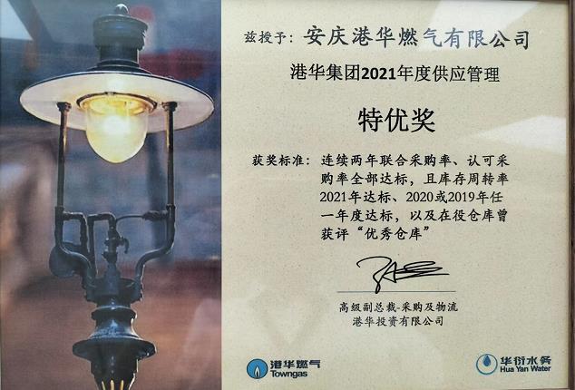 近日,安慶港華喜獲港華集團(tuán)2021年度“供應(yīng)管理特優(yōu)獎(jiǎng)”,這也是安慶港華繼獲“優(yōu)秀倉庫”獎(jiǎng)項(xiàng)后取得的又一殊榮。
