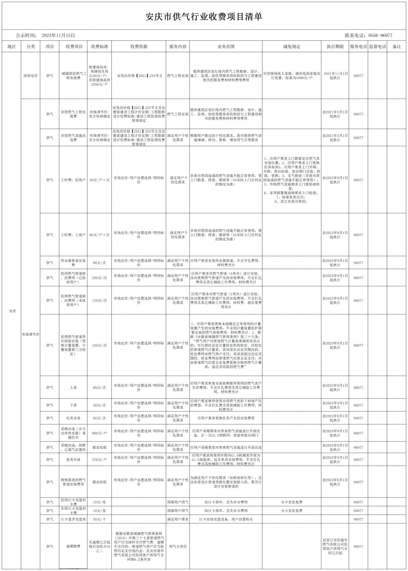 安慶市供氣行業(yè)收費項目清單(2023)