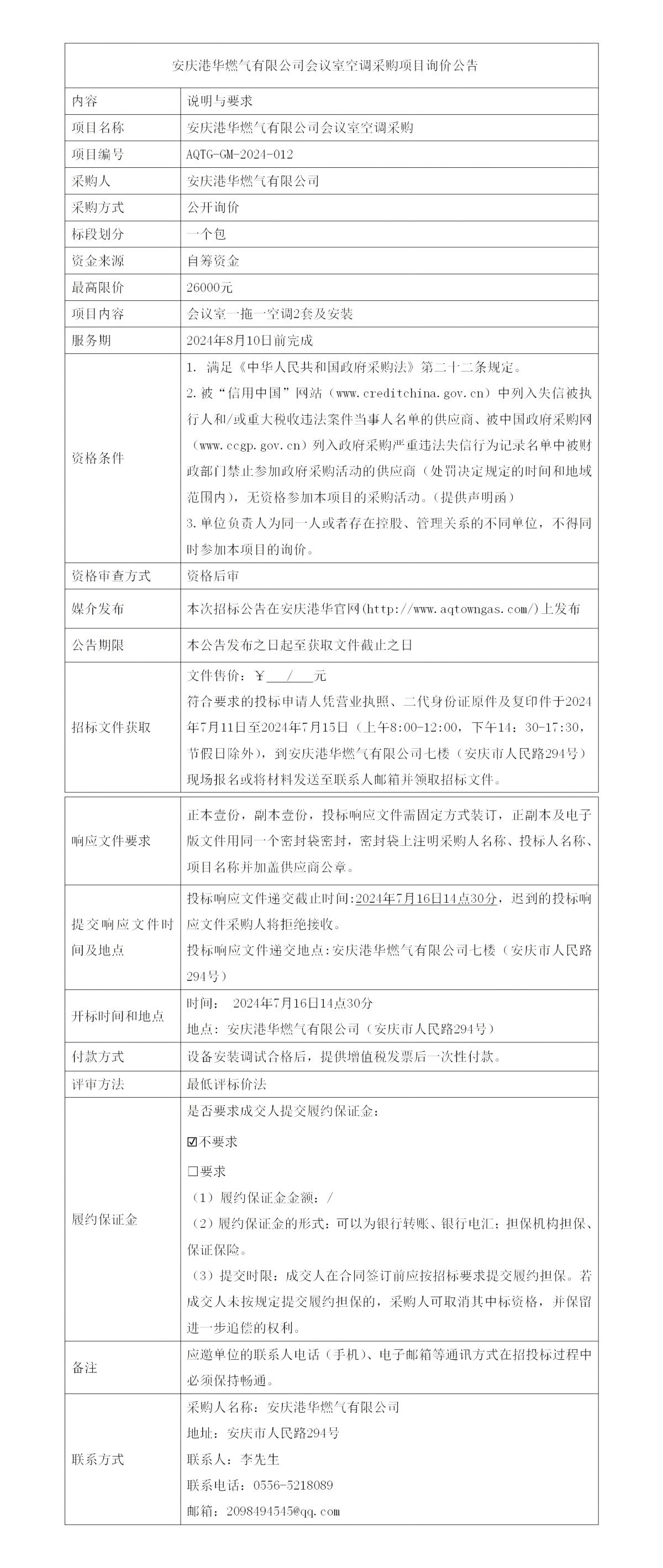 安慶港華燃氣有限公司會議室空調(diào)采購項目詢價公告