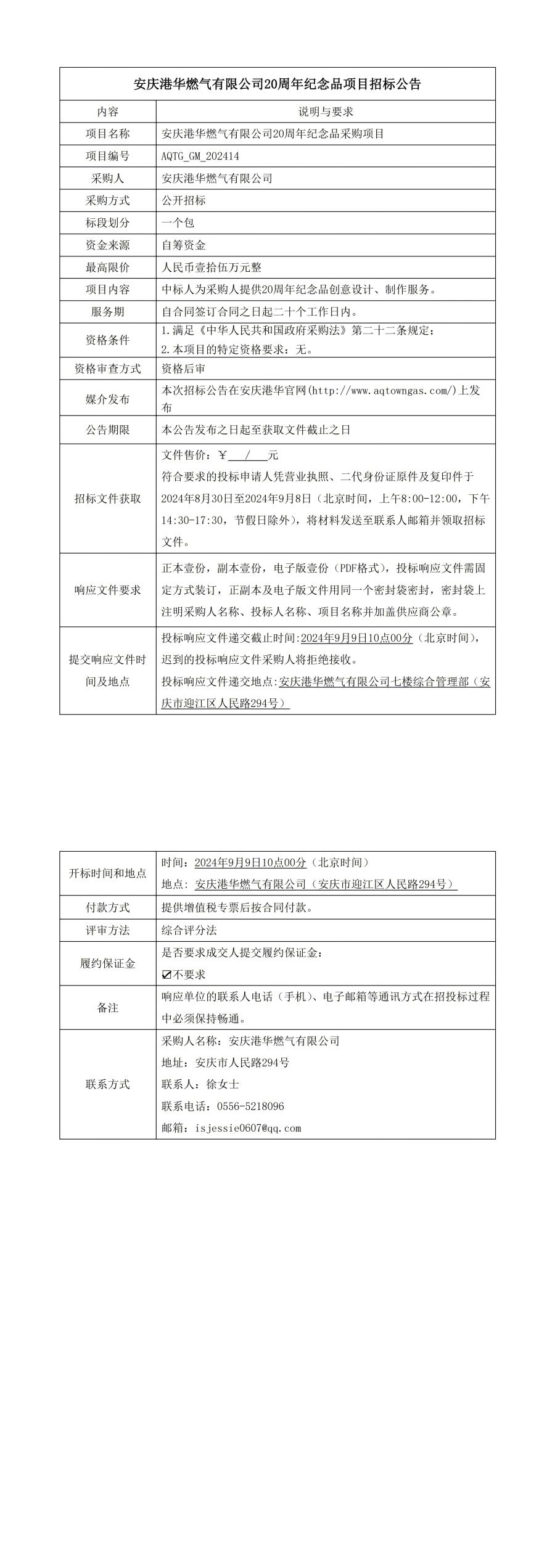 安慶港華燃?xì)庥邢薰?0周年紀(jì)念品項(xiàng)目招標(biāo)公告