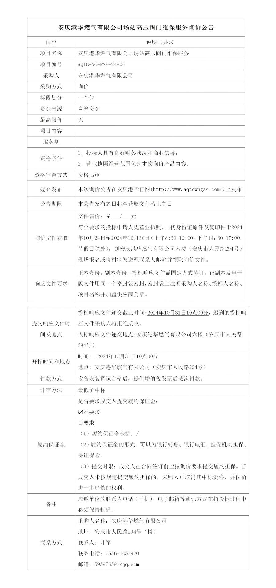 安慶港華燃氣有限公司場站高壓閥門維保服務(wù)詢價公告