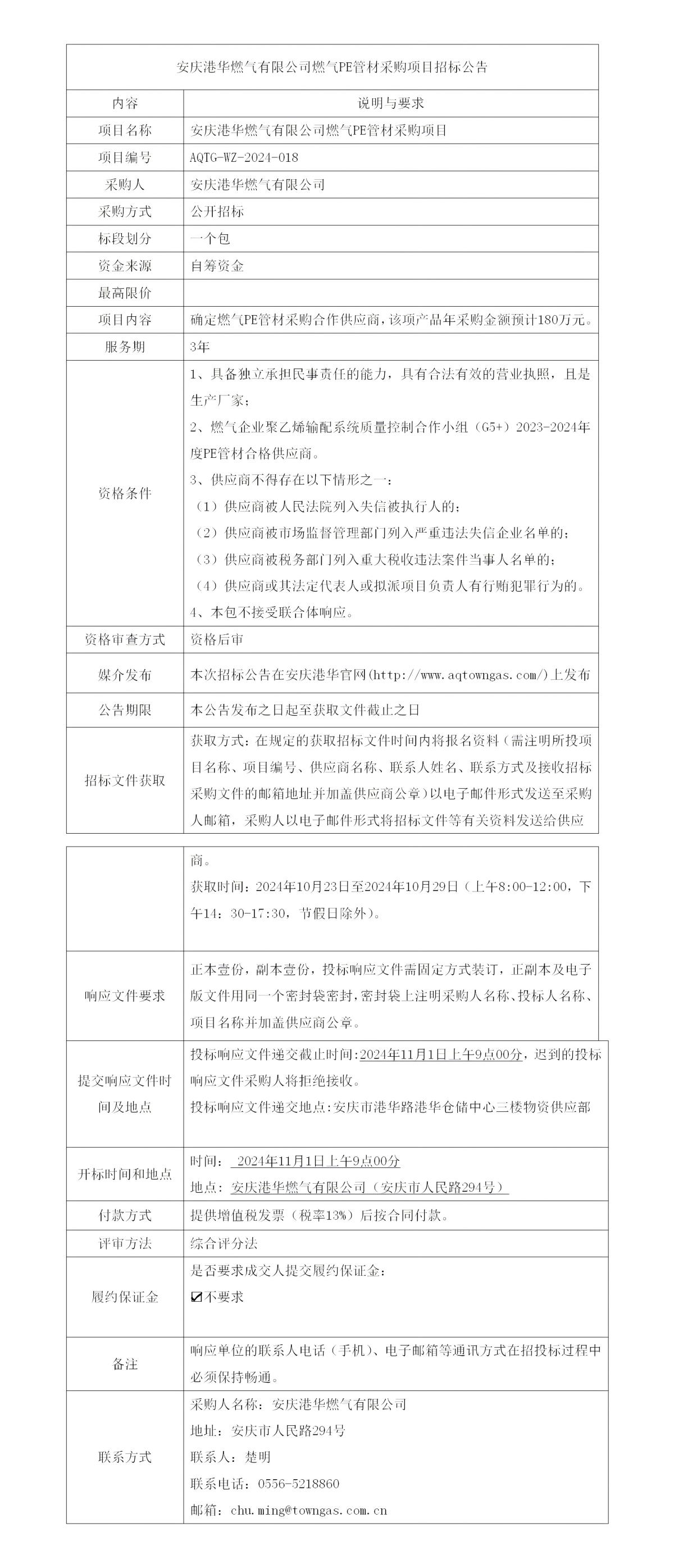 安慶港華燃氣有限公司燃氣PE管材采購項目招標(biāo)公告